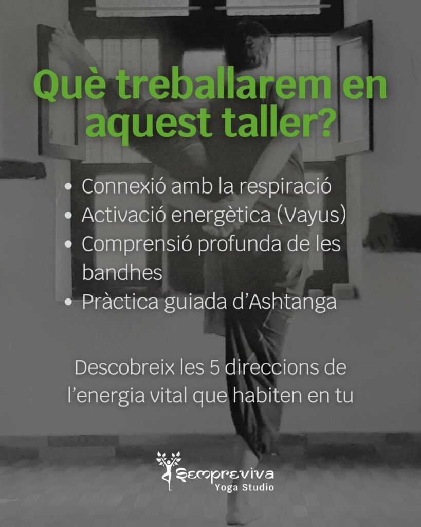 Treballarem l’equilibri dels Vayus (Prana) a través de la pràctica d’Ashtanga i els seus 3 Bandhes principals.